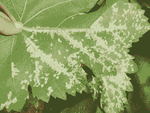 叶片正面出现不规则淡黄色半透明油浸状小斑点,逐渐扩大呈绿色,边缘界限不明显,多为数个小斑连成一个不规则或多角形的大病斑,并在叶背面产生黄白色的霜状霉层,病斑后期变成淡褐色,干裂枯焦而卷曲,严重时叶片脱落。
