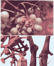(一)病状 此病主要为害果穗,有时新梢和叶片也被侵害。一般接近地面的果穗,其穗轴、果梗最先发病,受害部位初期出现水渍状的病斑,逐渐扩大,环绕穗轴,使其果粒软腐,振动时病粒容易脱落。在烂果表面上产生灰白色小粒点,即分生孢子器。潮湿季节受害变软的果粒表面破裂,溢出淡黄色粘液。
