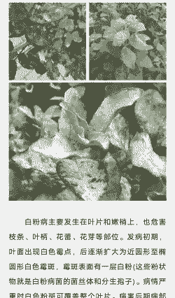 (1)生物防治:发病期用20%抗霉素100~200倍液喷雾防治;用菌妥防治白粉病,可达80%的效果;张月季等调查发现芽枝孢菌(Cladosporiumsp.)的寄生率达21.1%。