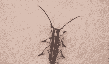 成虫体长6~11毫米,圆筒形,黑色。前胸被板中央有一红色卵圆形斑,腹部、足呈桔红色,鞘翅被密生灰色绒毛,触角与体长等。