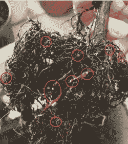 症状受害植株侧根和须根形成许多单生小结瘤,结瘤初色淡光滑,后变褐色粗糙。切开瘤组织,可见有白色发亮点粒,即为雌成虫。植株地上部分生长不良,切花产量、质量下降。