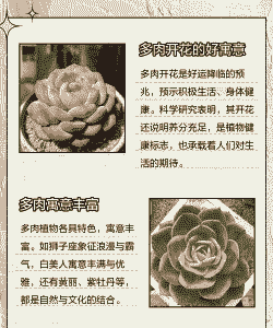 不同的多肉植物代表的花语含义不同,花语主要是来源自身的形象。多肉植物的花语是一心一意,像球形、圆形的多肉,带给人们一种团结、美满的感觉,寄托着人们希望家庭团圆、幸福快乐的美好愿望。赠送给自己心爱的人,能够表达对方的珍贵,对爱情永远一心一意的意思。