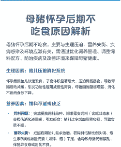 综上所述,母猪产后不吃食的原因多种多样,需要根据具体情况进行诊断和治疗。通过改善饲养环境、提供充足的营养和水分、控制疾病和减少心理压力等措施,可以有效促进母猪的食欲恢复。