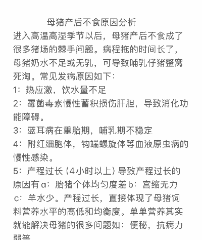 母猪产后不吃食是一个常见的问题,可能由多种原因引起。以下是一些主要原因及相应的治疗方法: