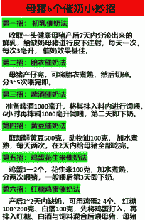 准备啤酒1000毫升,将其拌入料内进行饲喂,6小时后再拌料1000毫升饲喂,第二天即下奶。
