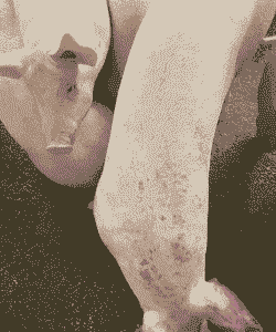 症状:母猪在产前产后体温升高,产程时间长可能导致缺氧,进而出现耳朵或全身发紫。病猪可能精神差、发热、体温在40-42℃之间,呈现稽留热,喜卧、弓背、寒颤及行走摇晃。全身皮肤、浆膜、粘膜和内脏器官可能有不同程度的出血。慢性型蓝耳病可能由急性型转变而来,表现为体温时高时低、食欲不振、便秘与腹泻交替出现、逐渐消瘦、贫血、衰弱、被毛粗乱、行走时两后肢摇晃无力、行走不稳。有些病猪的耳尖、尾端和四肢下部可能成蓝紫色或坏死、脱落,病程可能长达一个月以上,最后衰弱死亡,死亡率极高。