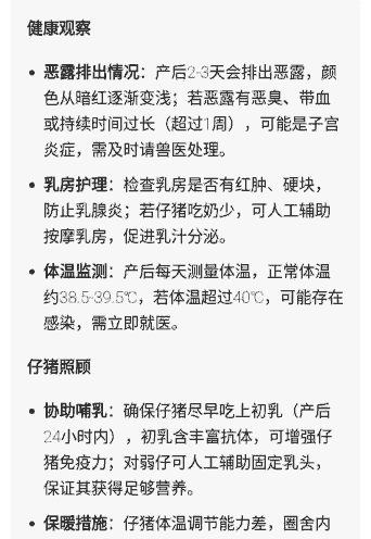 营养补充:适当增加钙、磷、有机硒和多种维生素,保障营养均衡,促进母猪恢复和乳汁分泌。