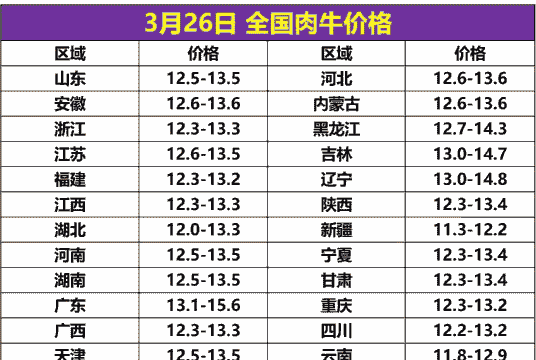 二、牦牛肉零售价格(2023年12月)鲜肉价格:每斤37-45元,前腿31-36元/斤,后腿36-38元/斤。