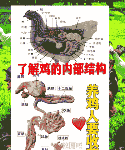 鸡肠:包括小肠(十二指肠、空肠、回肠)和大肠(盲肠、结直肠),负责消化吸收和排泄。