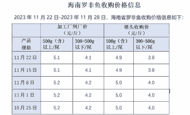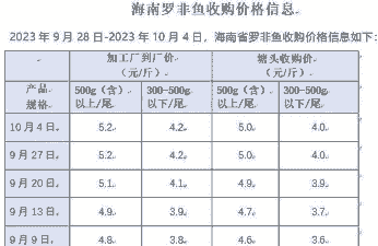 海南地区:加工厂收鱼价稳定,0.6-1斤为2.5元/斤,1斤以上为3.5元/斤,部分饲料厂保价收购略高0.2元/斤。