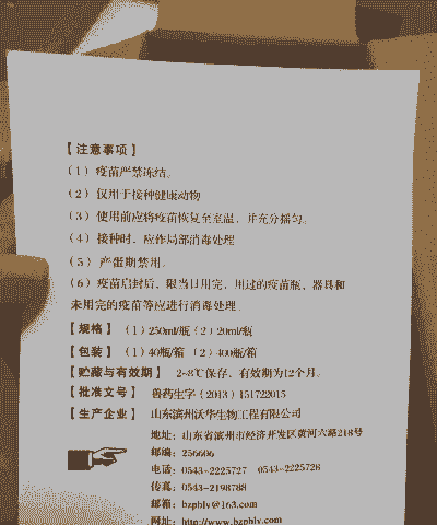 三、其他疫苗鸡痘疫苗: 夏秋季节需刺种,采用翅膀下翼膜刺种。 传染性鼻炎疫苗