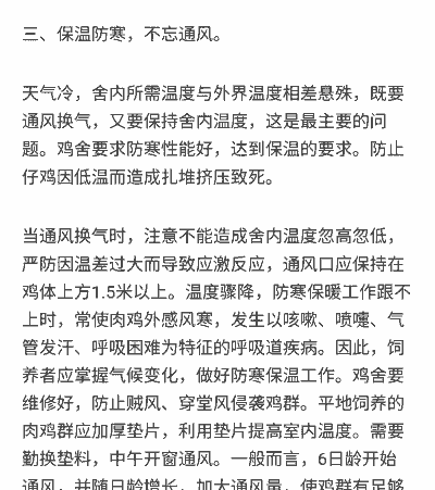 - 疫苗接种与监测: 定期对鸡群进行疫苗接种(如球虫病、新城疫),并做好疫情监测,发现疫情及时隔离治疗。 - 饲养管理