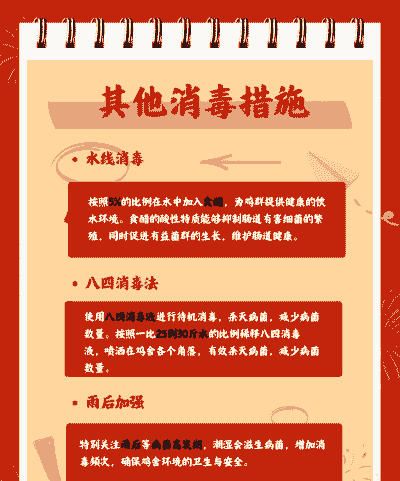 三、饮水消毒每周对饮水系统进行1次消毒,将消毒药(如过硫酸氢钾)加入水中浸泡1小时后再供鸡饮用,确保水质安全。