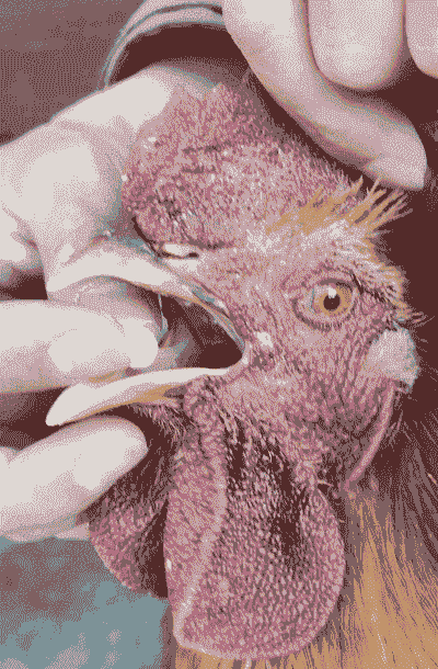 定期消毒水线、料槽,发病后用杆立克+土霉素治疗。