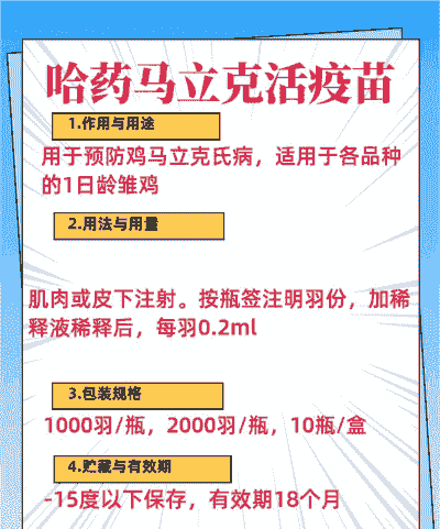 - 作用:预防马立克氏病,该病对鸡群危害极大,尤其幼雏易感染