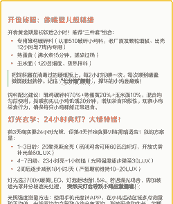 三、饲养管理进雏准备:雏鸡来自无疫病环境,建议自留种鸡自繁。旧房需用浓石灰水消毒2-3次,设备需提前调试至适宜温度。