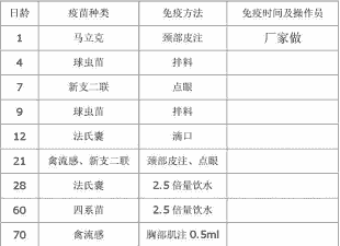 - 点滴法氏囊疫苗(弱毒苗),通过肠道免疫预防小肠球虫病和细菌性肠炎。
