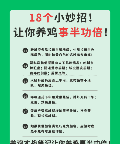 - 注意观察鸡群精神状态、粪便情况,发现异常及时隔离治疗。 - 常见疾病包括肠虫病、球虫病等,需针对性使用药物进行防治。