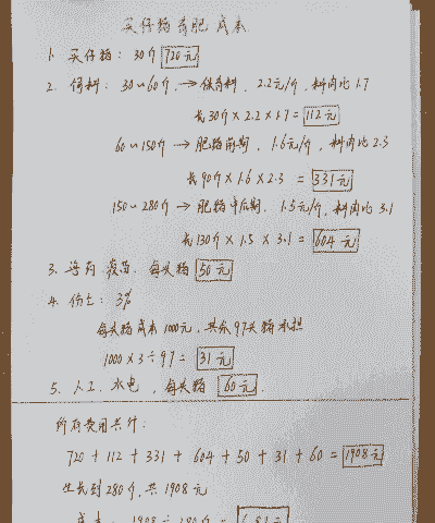 计算每头猪的总成本将所有直接成本和间接成本相加,然后除以出栏猪的总头数,得出每头猪的总成本。