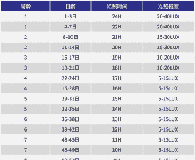 光照制度进雏后的1~3天为24小时光照制度,从4日龄到出栏22小时光照、2小时黑暗。