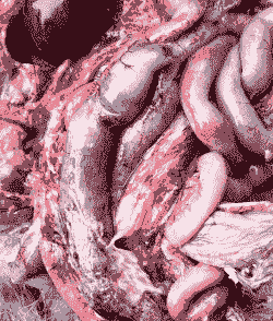 盲肠变得肿大,肠壁浆膜上可以看到很多圆形的出血斑点,肠壁变厚且粗糙,肠腔中出现很多带血物质。