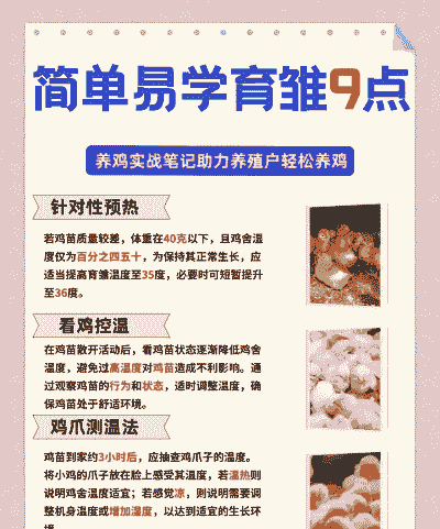 通风管理通风量:根据季节和室外温度调整通风量,保持育雏区域内的空气新鲜,同时防止贼风直接吹到雏鸡。