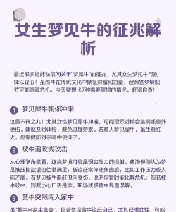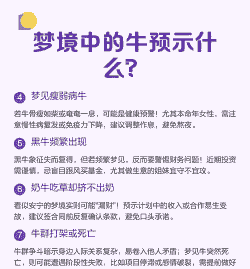 梦见养牛:在事业上保持积极进取的态度,注意与同事的关系,避免不必要的争执。求职者可以耐心等待机会,同时保持积极的心态。