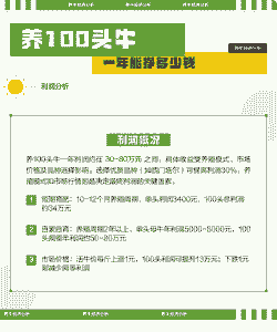 养100头牛的利润因多种因素而异,包括牛的品种、养殖方式、市场行情、饲料成本、疾病防控等。以下是一些具体的利润估算: