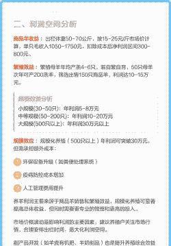 综合分析根据以上信息,养100只羊的头年利润大约为3600元,次年利润约为20万元。总体来看,养100只羊的利润与成本之间的差额较大,但具体利润会受到多种因素的影响,如市场价格波动、养殖技术、疾病防控等。