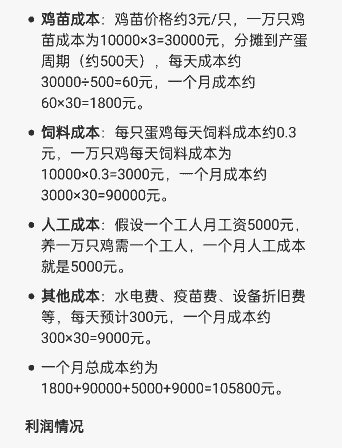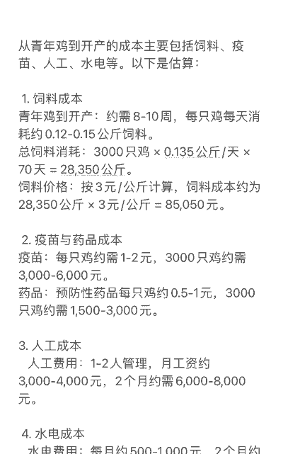 综合以上各项成本,蛋鸡养殖的总成本大约为: