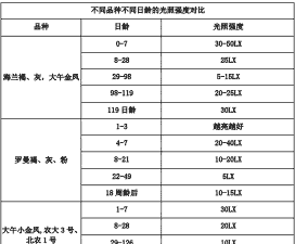 雏鸡阶段0-3日龄:每天光照23-24小时,夜间使用60瓦的灯泡提供光照。