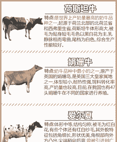 世界上的奶牛品种 近百种,其中最著名的有: