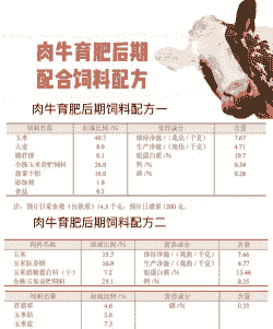玉米70公斤、麸皮13公斤、棉(杂)饼15公斤、食盐1公斤、骨粉1公斤,每头牛每天100克预混料,3~3.5公斤精料,粗饲料让其自由采食。