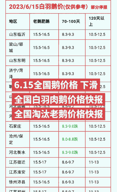 江苏扬州70-100天浙东鹅:12.2-14.5元/斤,120天以上浙东鹅:15-16.5元/斤。
