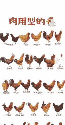 常见品种:北京油鸡、茶花鸡、固始鸡、白羽肉鸡、黄羽肉鸡、武定鸡、三黄鸡、成都白鸡及郑州红鸡等。