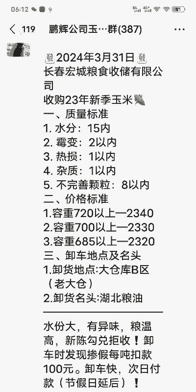 2024年12月24日锦州港玉米容重690-720,水分15,新粮装箱进港价格为2390-2420元/吨,较之前下跌10-20元/吨。