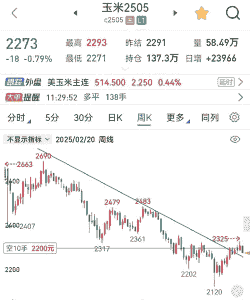 玉米期货市场价格呈现震荡上行趋势。例如,玉米主力C2505合约在1月24日收盘于2280元/吨,较昨日结算价上涨10元,涨幅为0.44%。