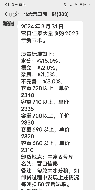 容重690-720,水分15%,新粮装箱进港价格:2390-2420元/吨。