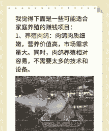 肉鸽养殖:肉鸽市场需求较大,营养丰富,具有食用和药用价值,是大众喜爱的滋补品。