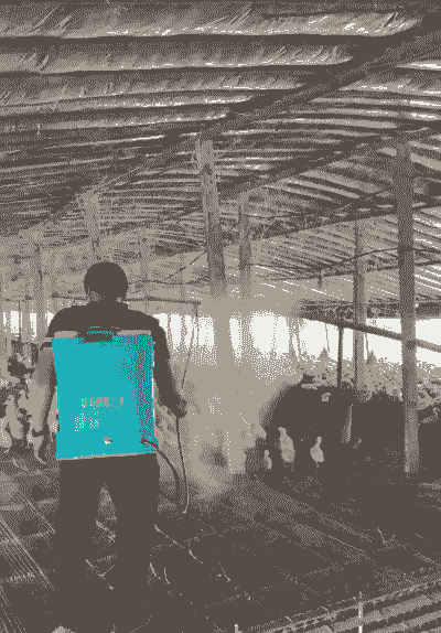 使用方法:将过氧乙酸溶解在水中,均匀喷洒在鸡舍内,待干后再进行清洗。稀释为0.3%溶液后,每立方米空间使用30毫升进行带鸡消毒。
