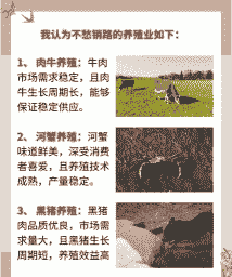 这些项目各有其特点和优势,可以根据自身条件和市场情况选择合适的养殖项目。建议选择市场前景好、风险较低、投资回报相对较高的项目,同时注重养殖技术和管理,确保养殖成功并顺利销售产品。