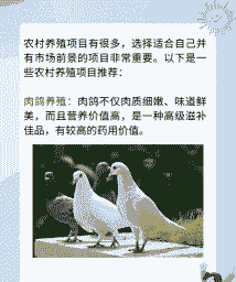 养肉鸽:肉鸽营养丰富,市场需求高,饲养简单,前期投资少,是成本低、投资少的致富项目。