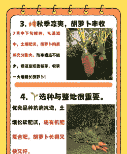秋季种植秋季也是胡萝卜播种的好时机,播种时间一般在7月至9月之间。7月中下旬是播种胡萝卜的适宜时间,最晚不宜超过8月上旬,通常在9月中旬收获。