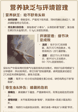 防治措施:保持鸡舍卫生,定期消毒,使用聚维酮碘等消毒剂进行消毒。确保鸡舍有足够的光照,并注意通风和温度控制。