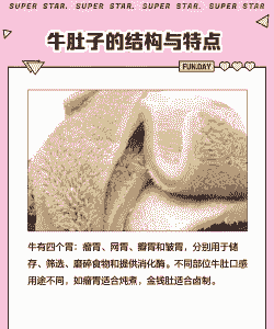 牛胃的不同部分因其结构和功能的不同,适合不同的烹饪方法和食用方式。以下是牛胃各部分的详细介绍及推荐食用方法: