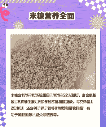 米糠含有多种维生素,包括维生素B1(硫胺素)、维生素B2(核黄酸)、维生素E等,这些维生素在能量代谢、抗氧化和维持神经系统健康等方面发挥重要作用。