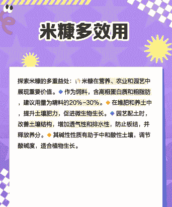 综上所述,米糠是一种营养丰富的天然食品,适合作为健康食品或膳食补充剂的一部分。然而,由于米糠的组成成分可能因加工方法的不同而有所差异,建议在食用前仔细了解其成分和营养价值。