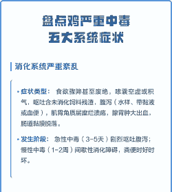 其他症状:包括口腔粘膜充血、鸡冠发紫、伸头呼吸等。
