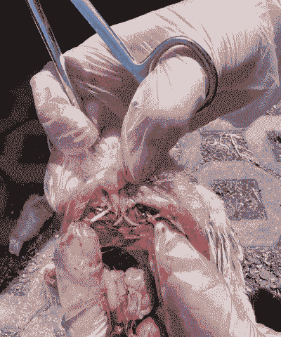 传染性支气管炎病毒感染鸡只后,18小时可见呼吸道纤毛缺损,黏膜上皮细胞变圆脱落,并有少量异嗜细胞和淋巴细胞侵润,严重时可见气管后端或支气管有干酪样的栓子。