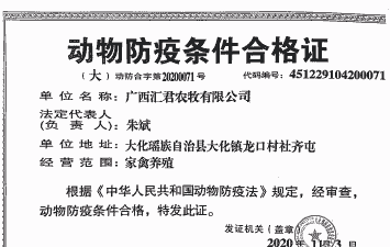这是由当地动物卫生监督机构颁发的证书,证明养鸡场符合动物防疫条件。